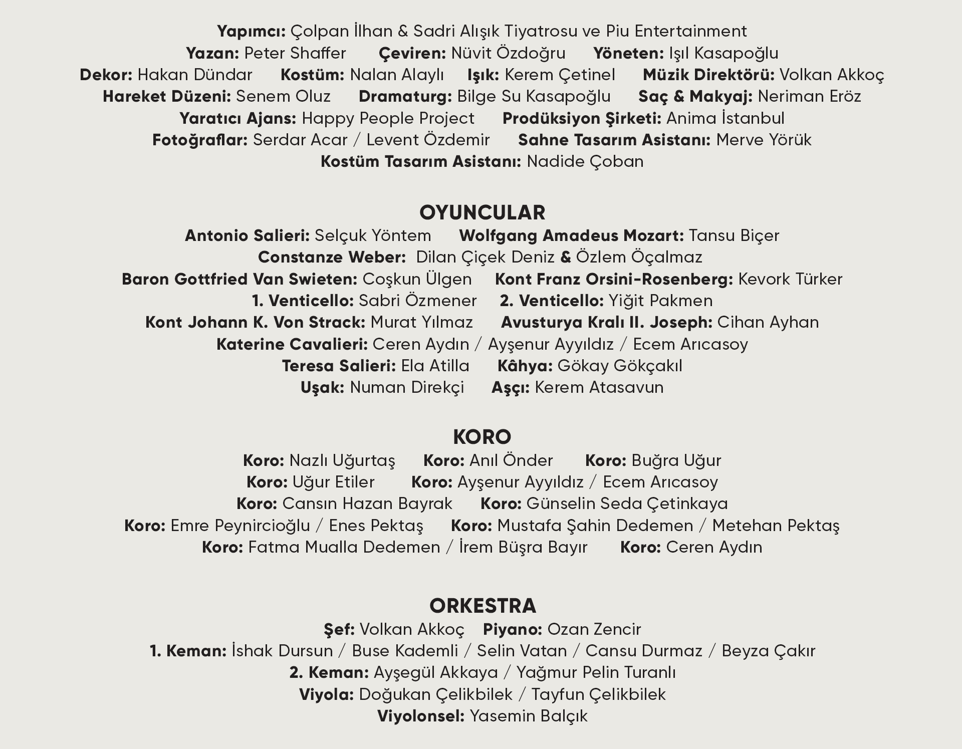Usta yönetmen Işıl Kasapoğlu rejisi ile, başrollerini Selçuk Yöntem (Antonio Salieri), Tansu Biçer (Wolfgang Amadeus Mozart) ve Dilan Çiçek Deniz (Constanze Weber)’in paylaştığı, sahne önünde 35, sahne arkasında 35 kişiden oluşan toplam 70 kişilik dev ekibiyle sezonun en çok ses getiren prodüksiyonlarından birisi olan Amadeus, tam 4 sezondur seyircisiyle buluşmaya devam ediyor.